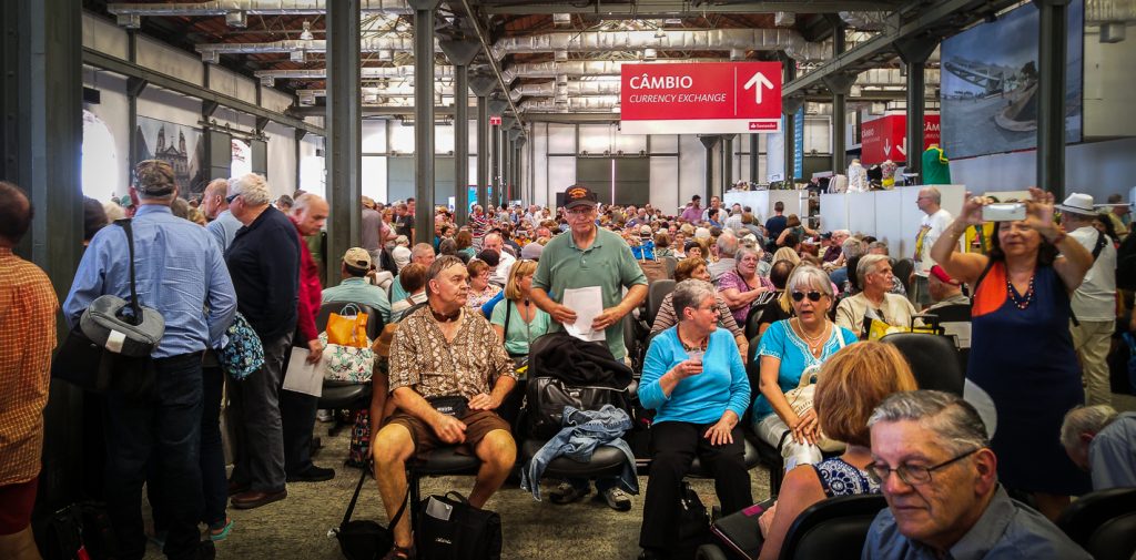 L’efficacité inexistante des Brésiliens (pas surprenant) à l’embarquement est vraiment étonnante. Nous resterons presque 2 heures et demi dans un grand hangar défraîchi, tassé comme des sardines, le tout accompagné d’une température de 30C et d’une humidité très élevée en attendant que notre numéro soit appelé. L’expérience se répète une fois de plus lorsque nous devons faire la queue pour rencontrer les douaniers Brésiliens qui estamperons notre passeport. Quels incompétents! Ils ont finalement créé un retard de près de deux heures ces cons… Nous savions que nous étions déjà en retard puisque le Crown Princess nous avait déjà avisé d’une inspection inattendue par les autorités portuaires.